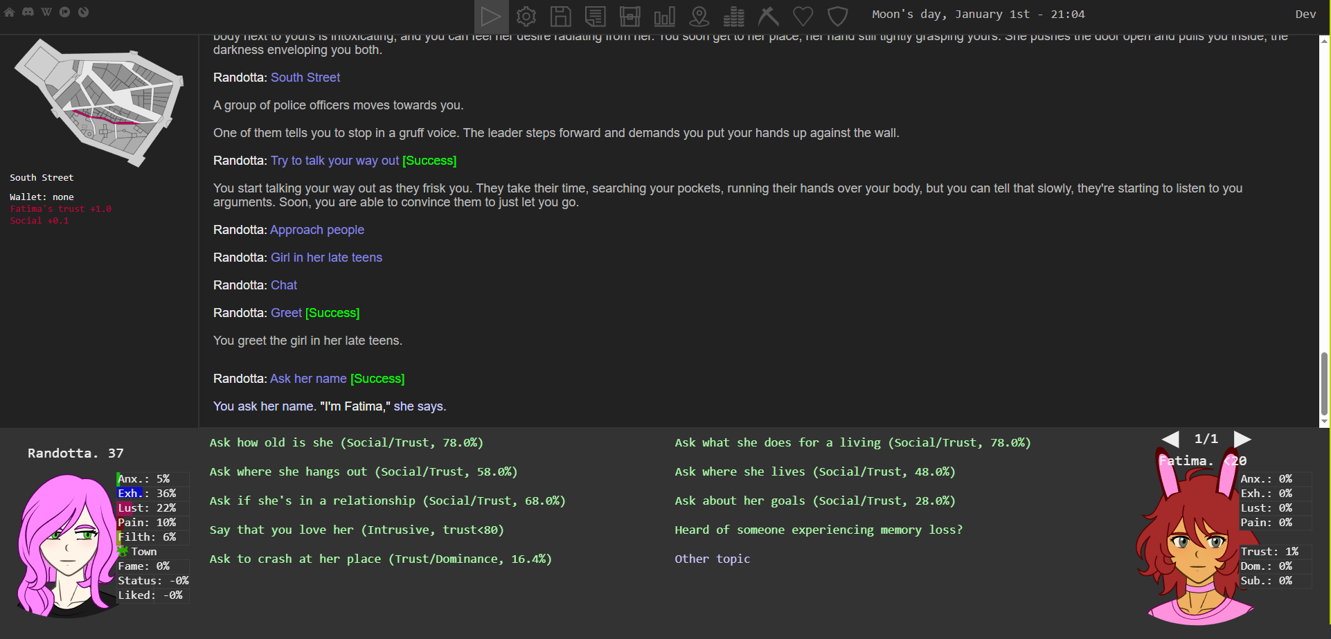 Nice update but i when i saved my game and exit the game and for couple of hours i play again it all freezes when i load the game i cant play it again it's just freeze all the character on left vanished and i cant touched text choices or anything (Ex. All choices: Market Street, And so on) its just 🥶 thts all 😭 im playing n andriod 0.5.2. v. Also some clothes wont load properly. I downloaded file couple of time just to make sure im not missing or something but its same thing. Pls Fixx 😭